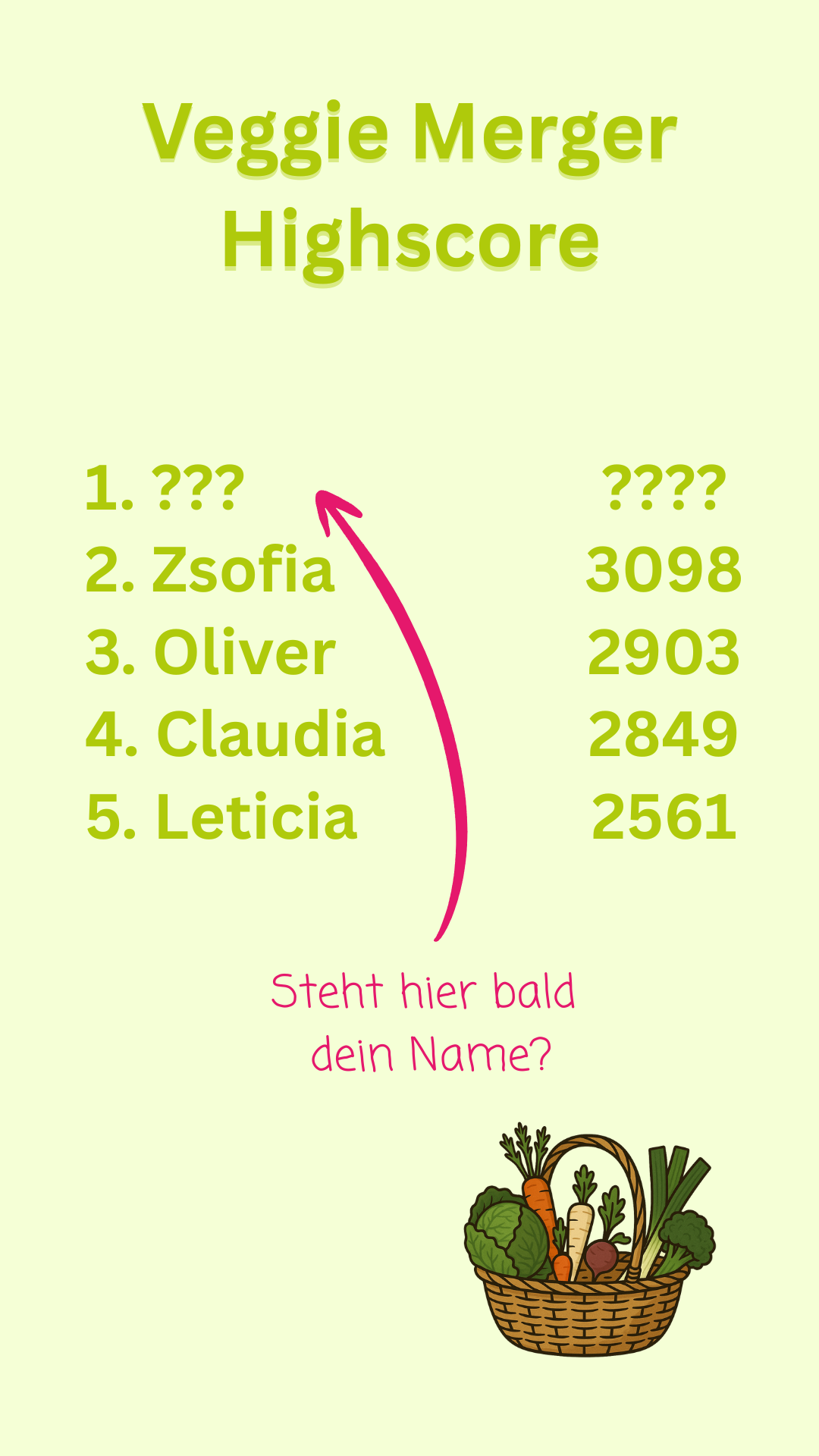 Vom 30.10.2025 bis 30.11.2025 läuft unser Wettbewerb. Gewinner:in des Wettbewerbs ist der/die Teilnehmer:in mit dem höchsten Punktestand beim «Veggie Merger». Die Teilnahme am Gewinnspiel erfolgt durch das Teilen bzw. Einreichen des erreichten Highscores in Form eines Screenshots über folgende Kanäle: