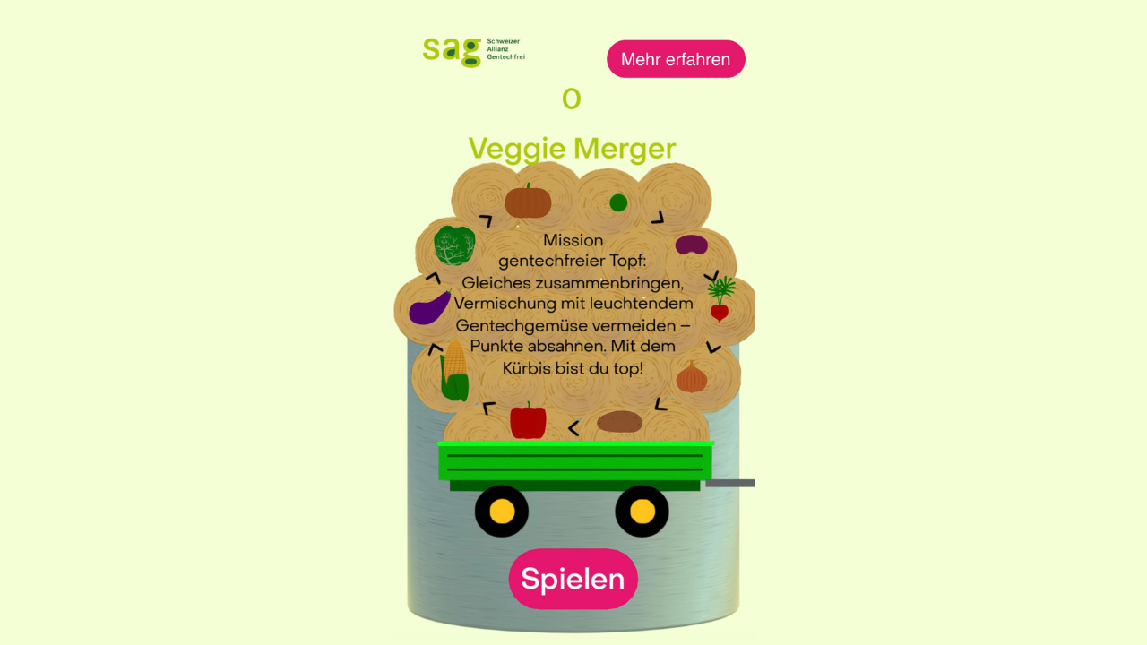 Dans le nouveau jeu « Veggie-Merger » de la SAG, tu peux voir à quelle vitesse les légumes génétiquement modifiés et non génétiquement modifiés se mélangent. Il est pratiquement impossible d’empêcher la contamination par des légumes génétiquement modifiés.